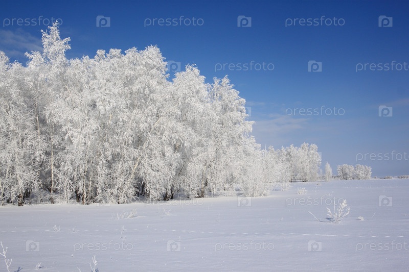 Зимний лес в льду против голубого неба