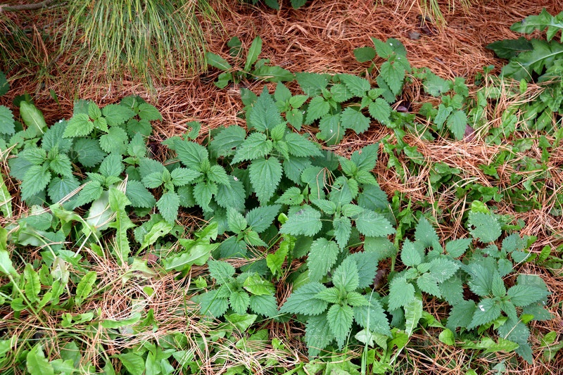Свежая крапивница, растущая через упавшие сосновые иглы