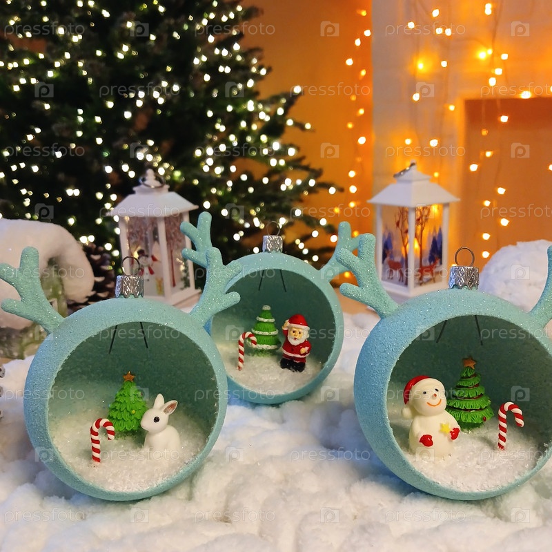Новогодние игрушки в форме мяча с рогами с маленькими миниатюрами внутри. Декоративные подарочные цилиндры для украшения вашего дома, офиса или в качестве подарка. Рождественская елка, Санта-Клаус, снеговик и зайчик