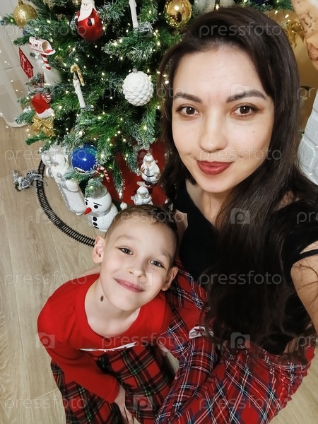 Женщина и мальчик сидят на полу перед украшенной рождественской елкой. На дереве светились гирлянды, орнаменты и пузыри. Уют и радость семейных праздников