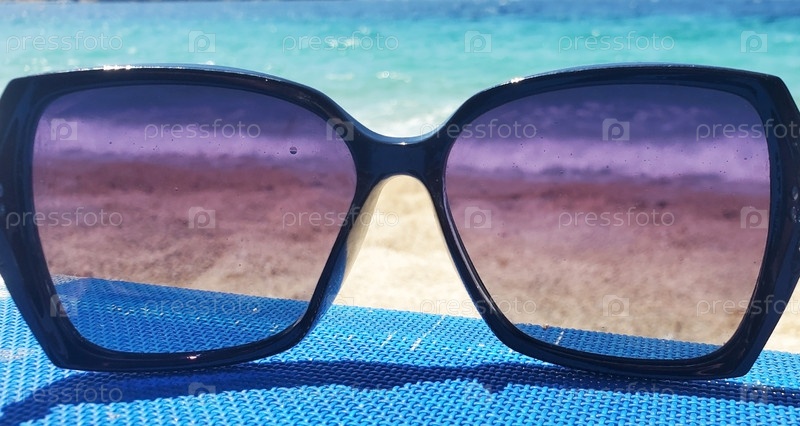 Пара солнцезащитных очков с темной рамкой лежит на синем пляжном кресле у моря. На заднем плане видны песчаный пляж и бирюзовая вода с мягкими волнами. Солнечный день, расслабление и беззаботное настроение