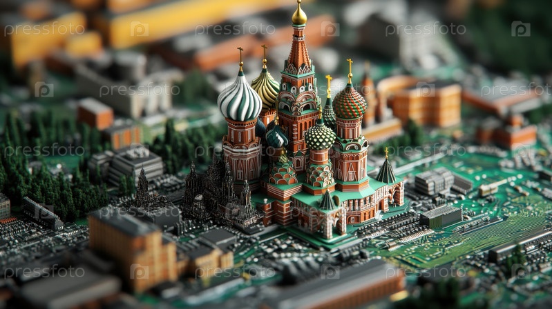 Это увлекательное изображение запечатлевает культовый собор Святого Василия в Москве ночью, красиво выделяя его яркие цвета среди пейзажа боке города