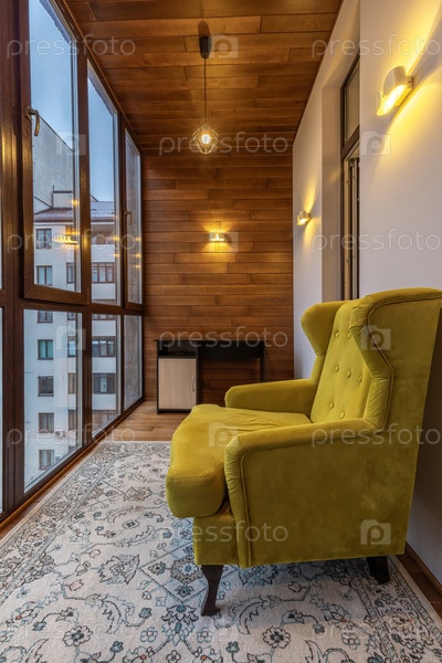Уютный уголок с желтым креслом, деревянными стенами и мягким освещением предлагает теплую и привлекательную атмосферу