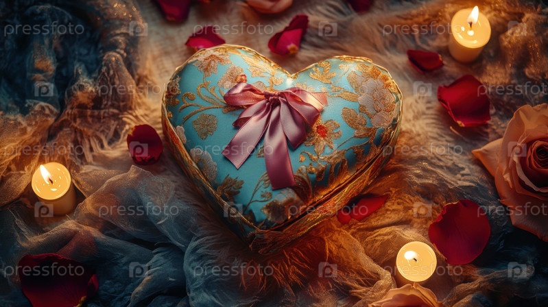 Романтический День святого Валентина с подарком в форме сердца, атмосфера под свечами