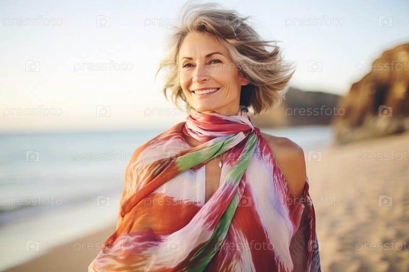 Портрет улыбающейся женщины, завернутой в одеяло на пляже