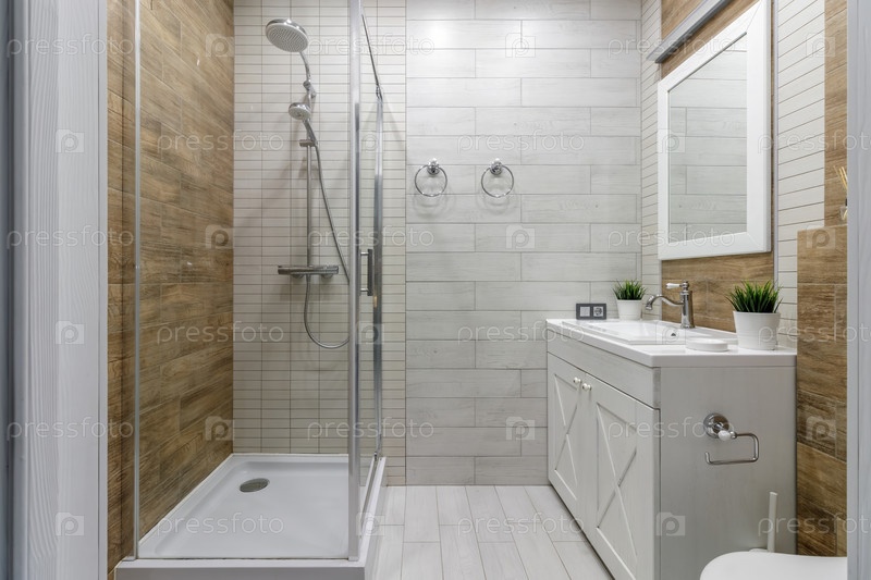 Чистый и функциональный дизайн ванной комнаты с современными арматурами, деревянными акцентами и стеклянным душем создает теплую и привлекательную атмосферу