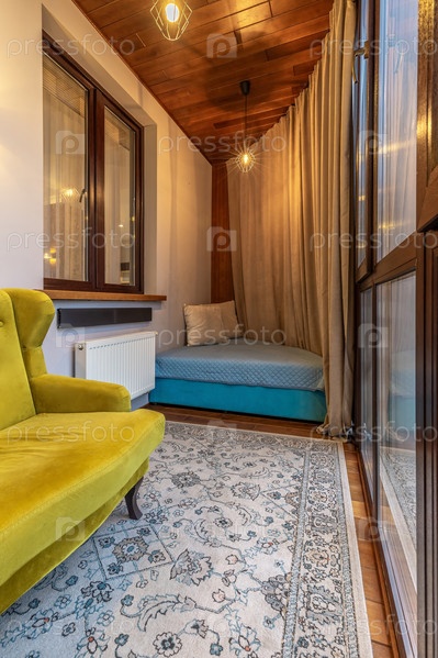Уютный уголок с желтым креслом, синим матрасом, мягким освещением и деревянными деталями создает расслабляющую и спокойную атмосферу