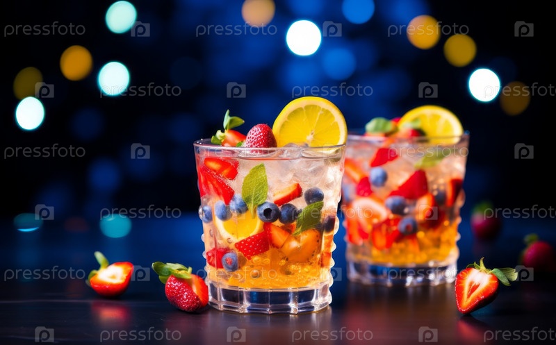 Обновление разноцветного фруктового коктейля со льдом, лимоном и мятой в баре, вечеринка в ночном клубе с безалкогольными напитками