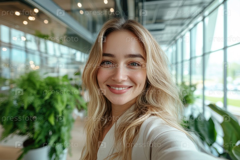 Профессиональное селфи в современном зеленом офисе со солнечным светом и растениями