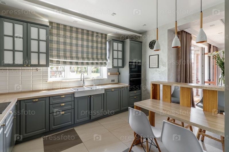 Просторная кухня имеет серые шкафы, деревянные столешницы и уютную обеденную зону, купающуюся в естественном свете