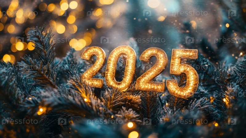 Изображение отражает яркую и блестящую атмосферу новогодних праздников с золотыми цифрами на 2025 год, в окружении праздничных украшений и боке