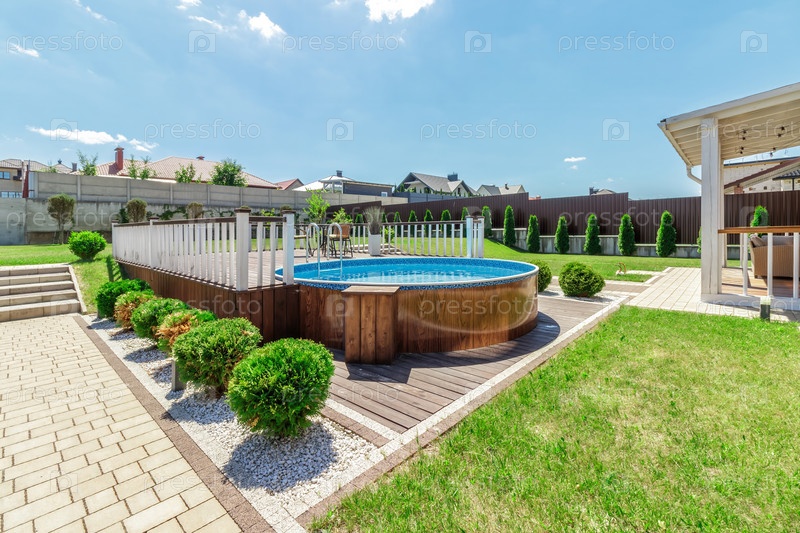 Уютный задний двор с поднятым бассейном и зеленым садом