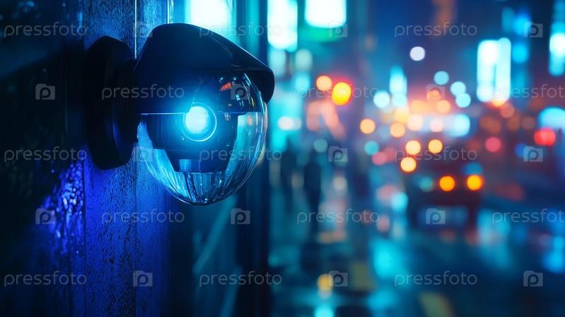 Камера видеонаблюдения в яркой ночной сцене города