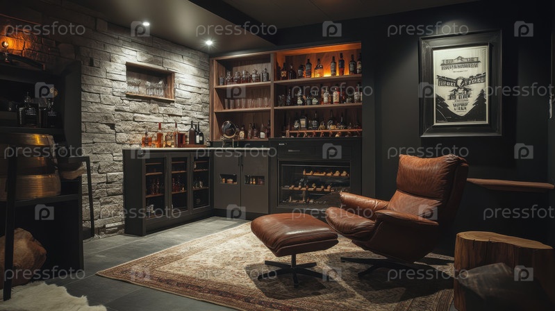 Уютный винтажный салон с коллекцией виски в деревенской обстановке
