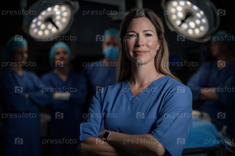 Решительная женщина-хирург в синих халатах стоит в операционной с ее медицинской командой на заднем плане под яркими хирургическими огнями