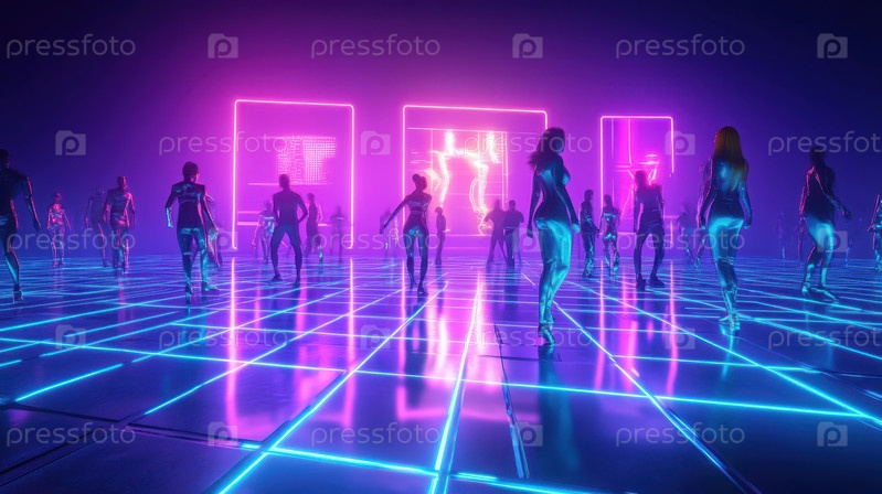 Яркий неоновый бассейн с людьми, танцующими в воде под красочными огнями в футуристическом городском пейзаже