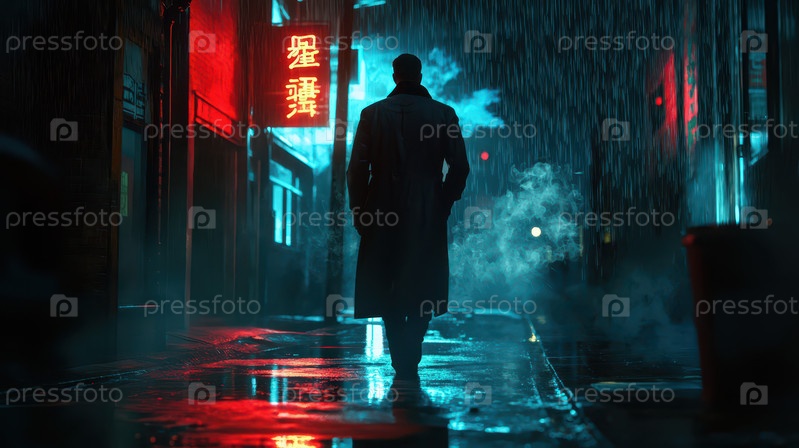 Мужчина в длинном пальто ходит под дождём на Неон Лит Лейн