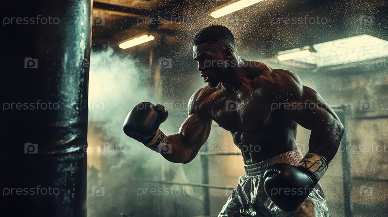 Мышечный боксер напрямую тренируется с мощными ударами по тяжелой сумке, создавая интенсивную энергию в тренажерном зале при слабом освещении