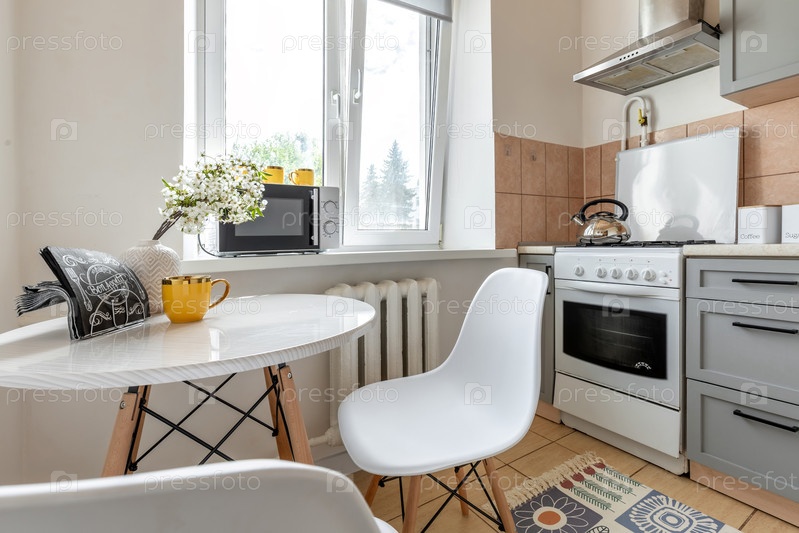 Уютный кухонный обеденный уголок с современными электроприборами