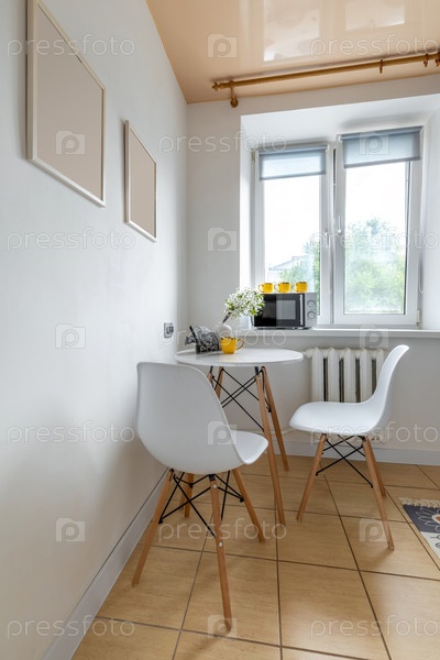 Уютная кухонная зона с круглым белым столом, современными стульями, цветочной вазой и микроволновой печи под естественным освещением окна