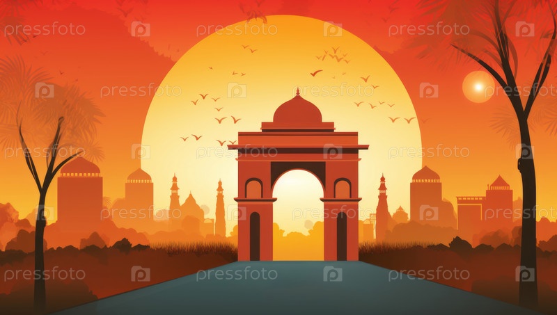 Иллюстрация силуэта индийского дворца с птицами, летающими на фоне заката