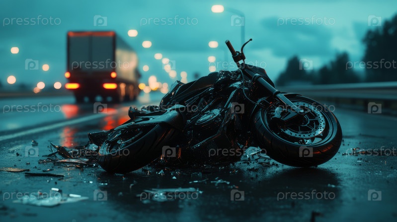 Сцена столкновения мотоцикла и грузовика в дождливый вечер