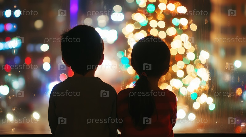 Дети смотрят на цветные рождественские огни через окно