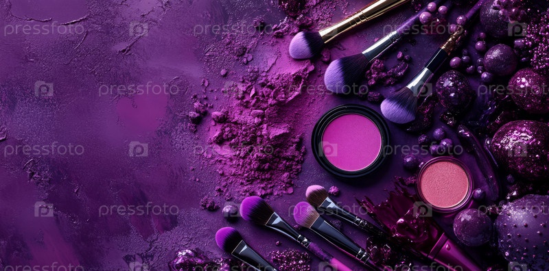 На этом изображении запечатлена красиво расположенная коллекция элегантных фиолетовых продуктов красоты, отражающих творчество и стиль