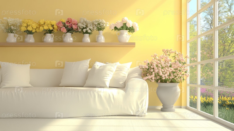 Солнечный свет наводняет уютную жилую зону, выделяя белый диван и ярко-желтые стены, создавая теплую приглашающую атмосферу с естественной зелени