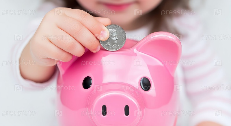 Ребенок держит розовую свинину и готовится вставить монету, символизирующую важность экономии денег с раннего возраста