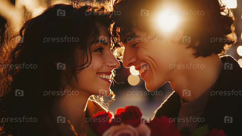 Пара делится интимным моментом в окружении светящихся огней и красных роз, создавая уютную и романтическую атмосферу