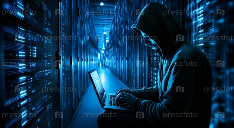 Фигура с капюшоном управляет ноутбуком в серверной комнате, символизируя современную киберпреступность и цифровой шпионаж
