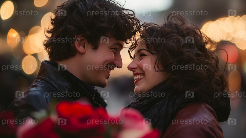 Пара делится интимным моментом в окружении светящихся огней и красных роз, создавая уютную и романтическую атмосферу