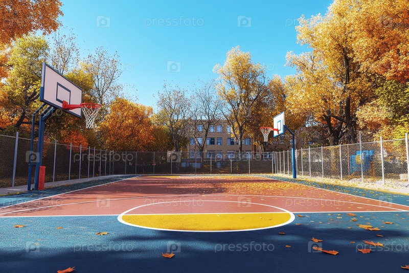 Спокойный баскетбольный корт в окружении ярких осенних деревьев приглашает игроков насладиться солнечным днем на свежем воздухе