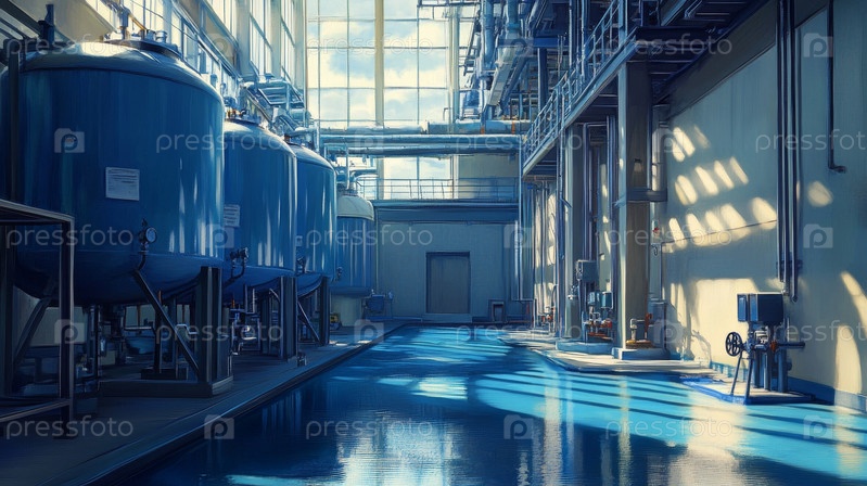 Современное промышленное сооружение с синими резервуарами и солнечным светом