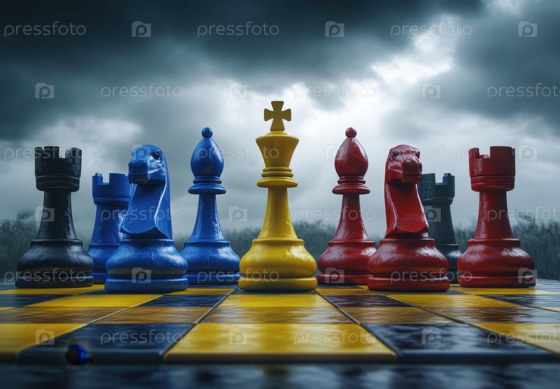 Красочные шахматные фигуры на абстрактной доске под модным небом