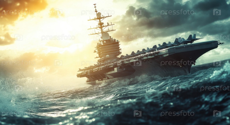 Величественный авианосец плавает над океаном при восходе солнца