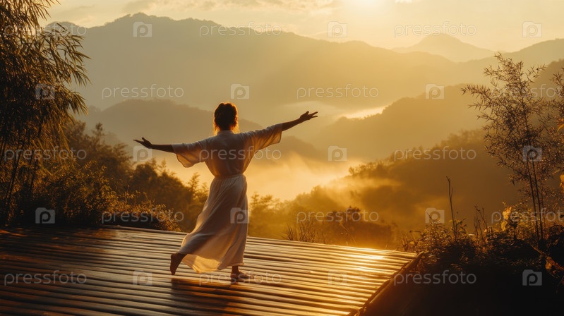 Женщина практикует тай-чи при восходе солнца в горах