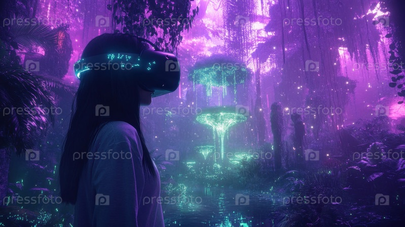 Женщина, исследующая виртуальную реальность Фантастический лес