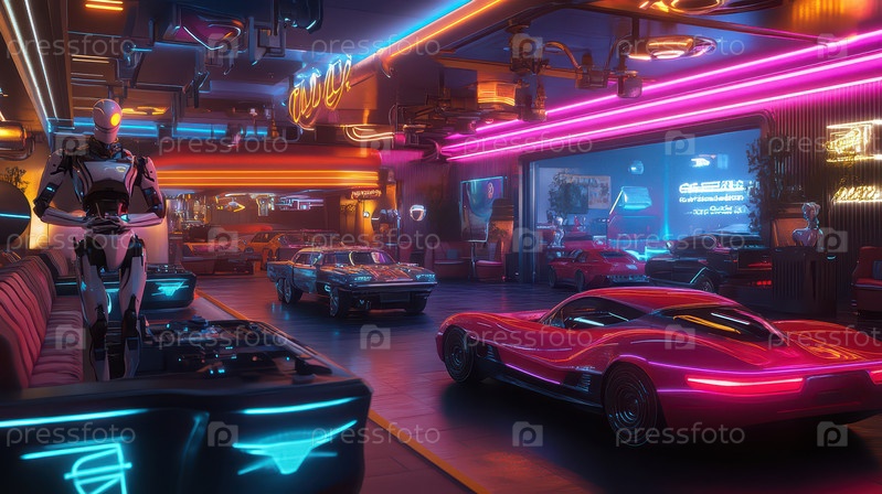 Футуристическая неоновая городская улица ночью с ретро-автомобилями и гуманоидными роботами