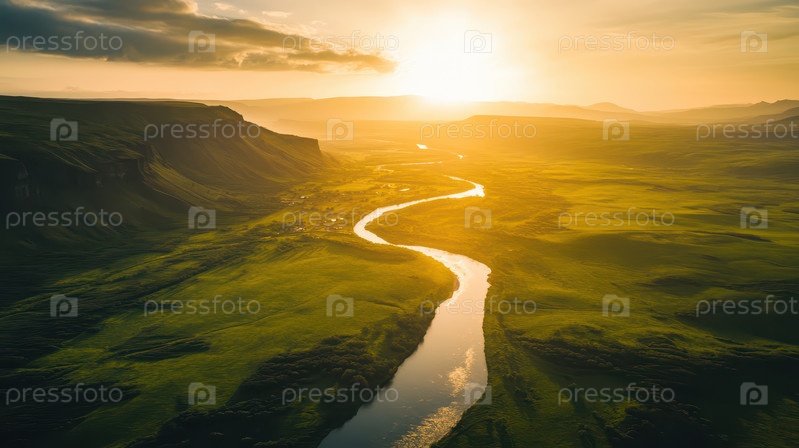Закат солнца над извилистой рекой в Зеленой долине