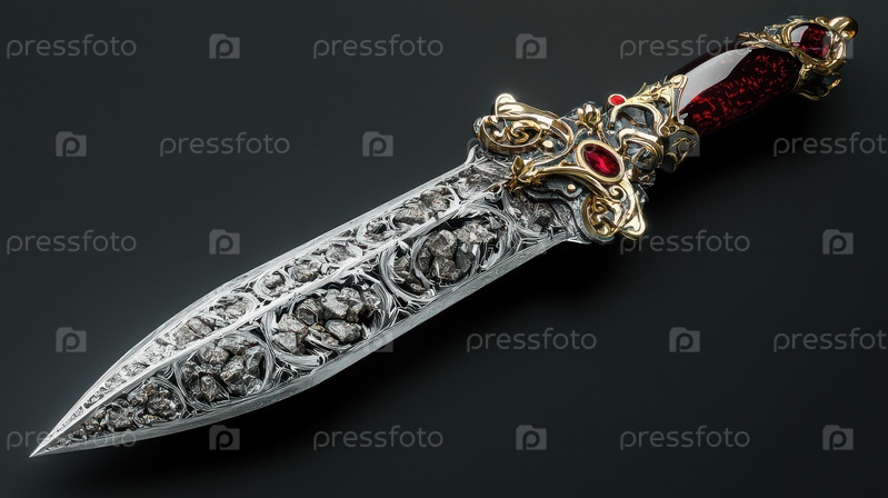 Красиво выполненный декоративный меч со сложными узорами на лезвии и драгоценной ручкой с красными жемчужинами, создавая роскошный и королевский вид
