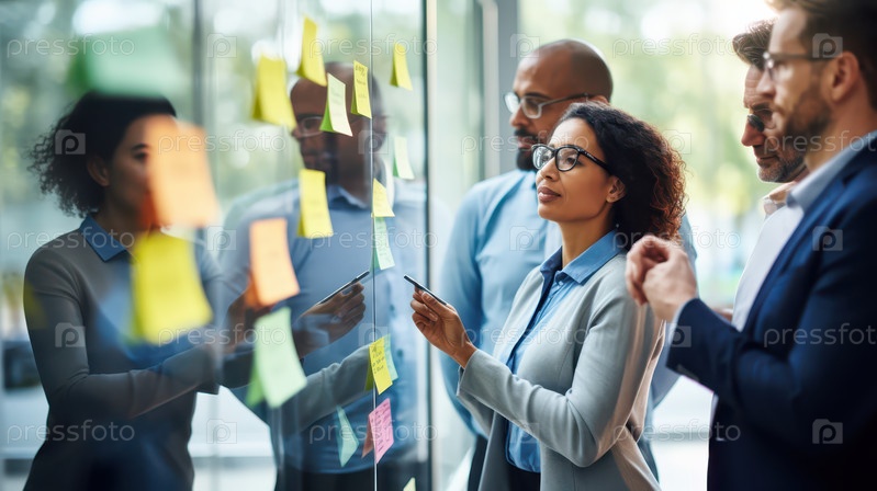 Сосредоточенная бизнес-команда разрабатывает новые стратегии с помощью красочных наклеек на стеклянной стене в современном офисе