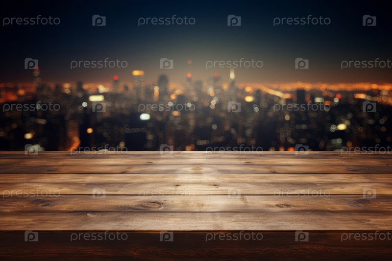 Деревянный стол на фоне ночного вида города в размытом виде.Мокап, инсталляция продукта, пространство для копирования