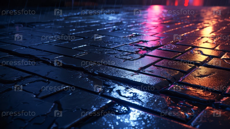 Закройте вид на пронесённый дождем городской тротуар, захватив отражение неоновых огней ночью и детальную текстуру мокрого камня