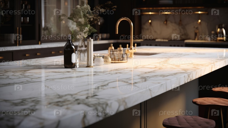 Закройте вид на мраморную столешницу в современном кухонном интерьере с размытым, избирательным фокусом и малой глубиной поля зрения