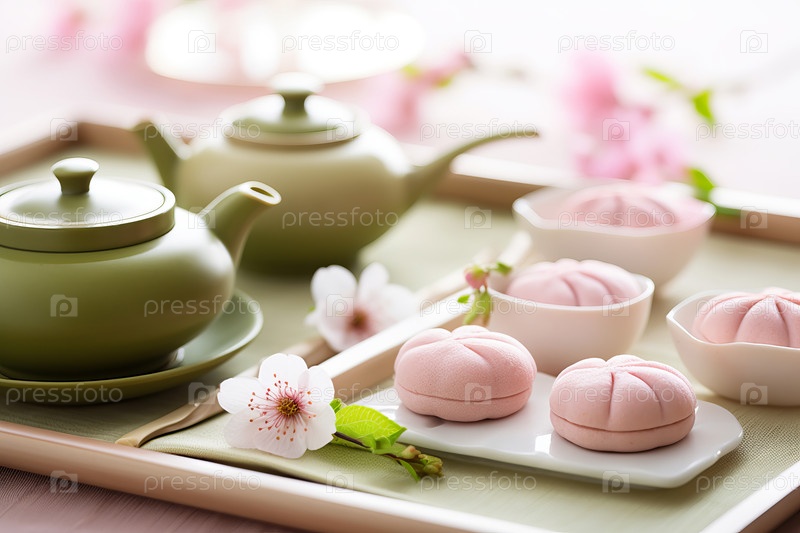 Церемония чая, с чайником и тарелкой нежных десертов из мочи и вишневых цветов
