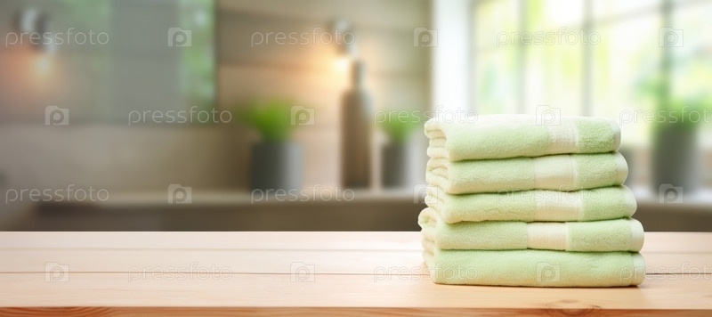 Стол зеленых полотенцев на деревянном столе на фоне ванной комнаты в размытой форме с копировальным пространством