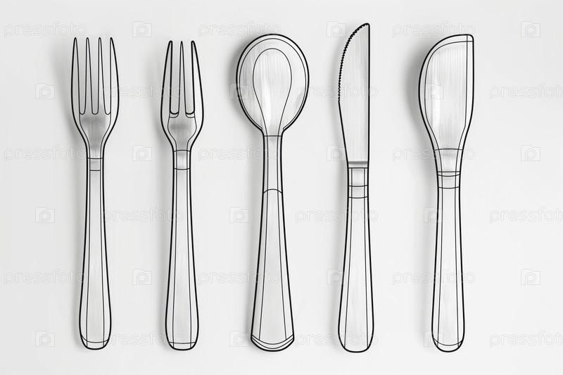Черно-белый минималистический эскиз, показывающий различные конструкции столовых приборов, включая вилки, ножи и ложки