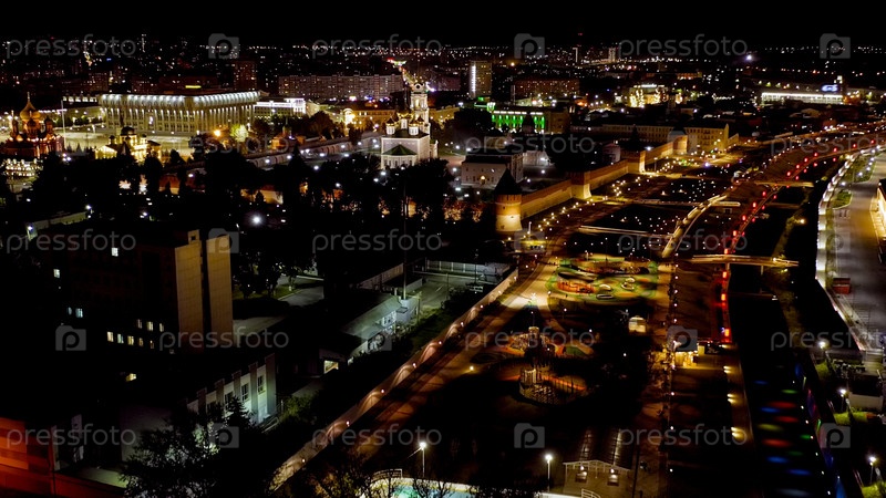 Тула, Россия.Вид города ночью из воздуха.Кремль Тулы, площадь Ленина и набережная реки, вид с воздуха